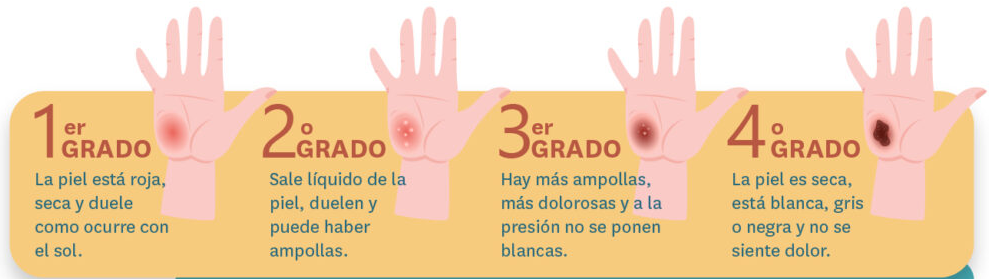 Las quemaduras de primer grado afectan solo la capa externa de la piel, causando enrojecimiento, dolor e hinchazón leve. Generalmente sanan en unos pocos días y no suelen dejar cicatrices. Es importante mantener la quemadura limpia y protegida para prevenir infecciones.Las quemaduras de segundo grado afectan tanto la epidermis como la dermis, causando enrojecimiento, ampollas y dolor intenso. Es importante buscar atención médica inmediata para tratar este tipo de quemaduras y prevenir infecciones. Se recomienda no romper las ampollas y mantener la zona afectada limpia y protegida.2. Quemaduras de segundo grado